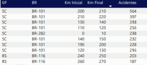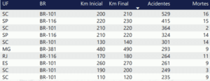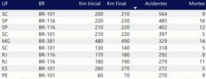 Tabela 1. Os 10 trechos rodoviários mais perigosos do Brasil em número de acidentes em 2023